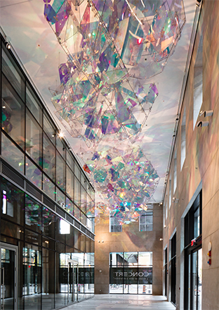 Spectrum is organized in nature, its form determined by the mathematical properties of the golden ratio. 1449 polycarbonate dichroic plates manipulate light and colour, reflection and refraction creating infinite visual moments. Cecil Balmond described “Spectrum runs in a river of colour with vortex and swirling flow…” and posed the question “its precise geometry and angled intersecting planes introduces a quantum ambiguity - is it solid wave or a liquid geometry?”