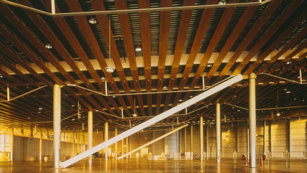 For the lowest of budgets, this low-orbiting egg structure, created to mark the spectacle of the Tour in France in 1994, provided a series of small miracles in its organisation, appearance and technicalities. A vast compendium of space, it includes three main areas: Congrès, comprising lecture halls, restaurants and offices, Zenith, a huge amphitheatre and Expo, a vast exhibition space. What binds the three programs is a unifying geometry, a dipping concave roof that takes the shape of an ellipse. What could so easily have been a deadening industrial type roof is transformed by Balmond into a stunning design that echoes a beautifully laminated boat hull. Proposing timber not just as a cosmetic add-on, Balmond makes the wood material itself the structure, as the tension boom of a truss. Bringing steel and timber together in very unusual circumstance, hybridization runs free along the roof.
