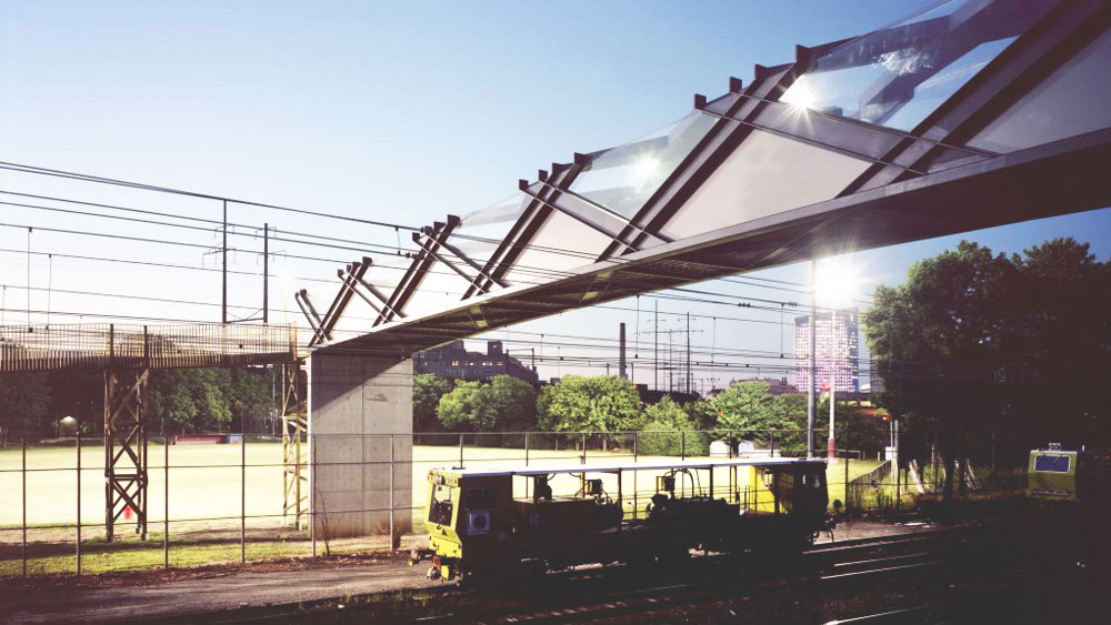 Combining the immediate landscape and tectonic form in one unfolding strategy, in true elevation the Weave looks like a conventional bridge. It is anything but. Built as a landscape strategy for the University of Pennsylvania in 2007, traces of the bridge begin at a sports field furthest from the railway and wind their way, gaining force as they approach the train tracks. The trace begins to rise off the ground in a slow ascent, turning into tectonic threads and then, in a burst of energy, spins across the railway in a close spiralling form. Woven into those lines are routes for pedestrians and landscape. The Weave, like DNA, spins several sequences and multiple narratives.